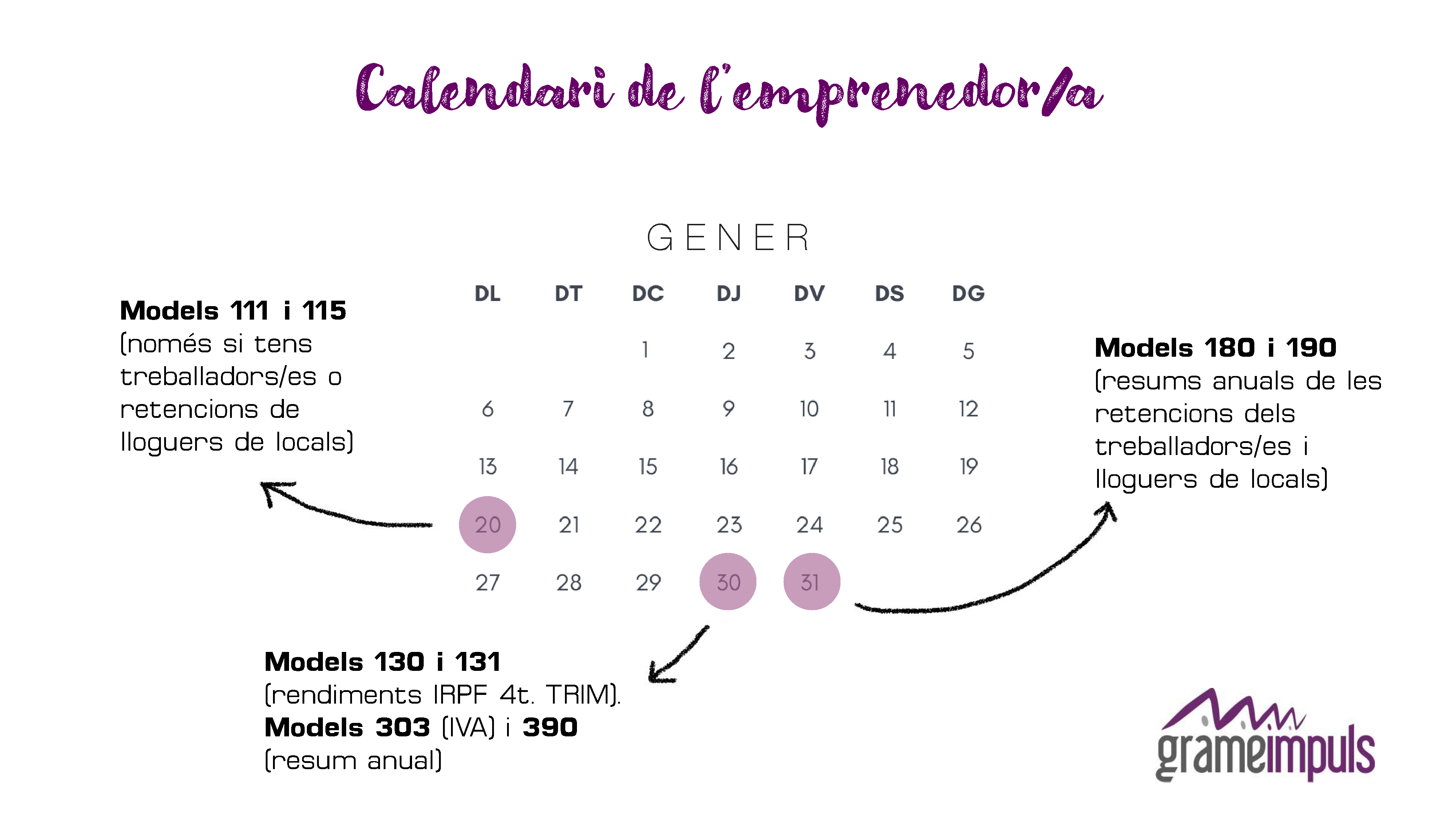El de gener és uns dels mesos més burocràtics per a les persones emprenedores autònomes, ja que han de tancar el quart trimestre de 2019, així com tot l’exercici fiscal. És un període en què els treballadors i les treballadores per compte propi han de presentar molts i molt diversos models a Hisenda. Si ets emprenedor o emprenedora, et recordem en aquest post les dates claus que has de marcar al teu calendari fiscal. Apunta!